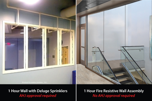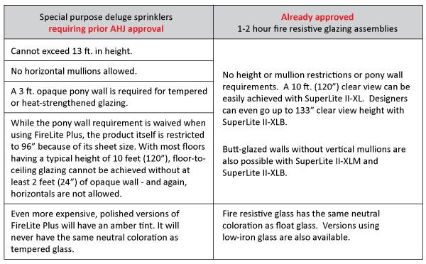 So before going through the AHJ approval process for this alternate assembly using deluge sprinklers, here are a few concerns to help architects and owners make an informed decision. This is in comparison to readily available, USA-made, 1-2 hour fire resistive glazing assemblies that do not need prior AHJ approval.