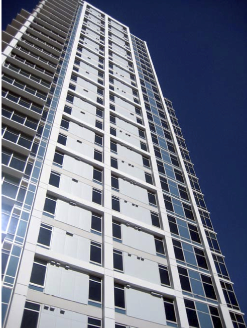 The windows and glass balconies on the 32 floors on the south façade of Sapphire Towers in San Diego are fire rated.