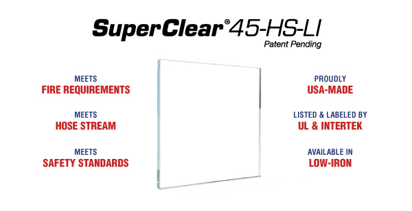 SuperClear® 45-HS-LI is a game changer as a monolithic glass product that meets fire, hose stream and safety requirements without wires, tints, films, or laminates, says San Diego. “[In the past] designers accepted expensive, brittle, imported ceramic products because it was the only option available,” she says.