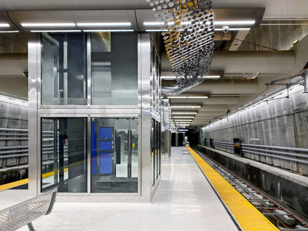 In addition to the 2-hour glass floor, SAFTI FIRST® also provided the fire rated glazing and framing for the 2-hour glass elevator enclosures, using SuperLite® II-XL 120 in GPX® Architectural Series Framing, provide an open and airy feeling, while traveling 70 feet below ground then through the station to reach the station’s platform. Each level is connected by SAFTI FIRST®’s clear decorative fire rated glazing to continue this airy artistic feeling with light flowing down through each floor.
