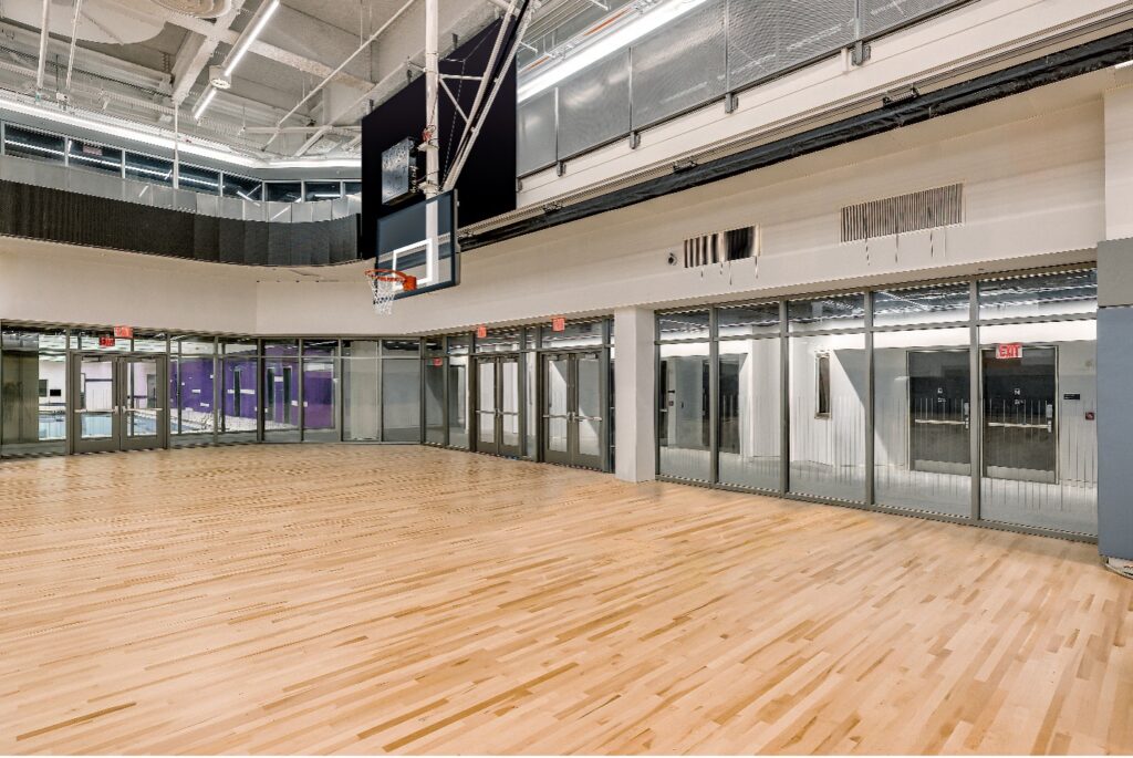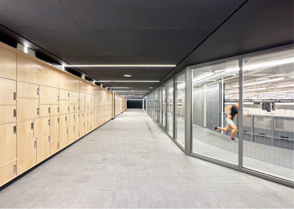In high-traffic areas like the gym and track, floor-to-ceiling, these fire resistive glass walls and doors were used to maintain clear visibility across zones, transforming what could have been a maze of enclosed rooms into an interconnected environment.