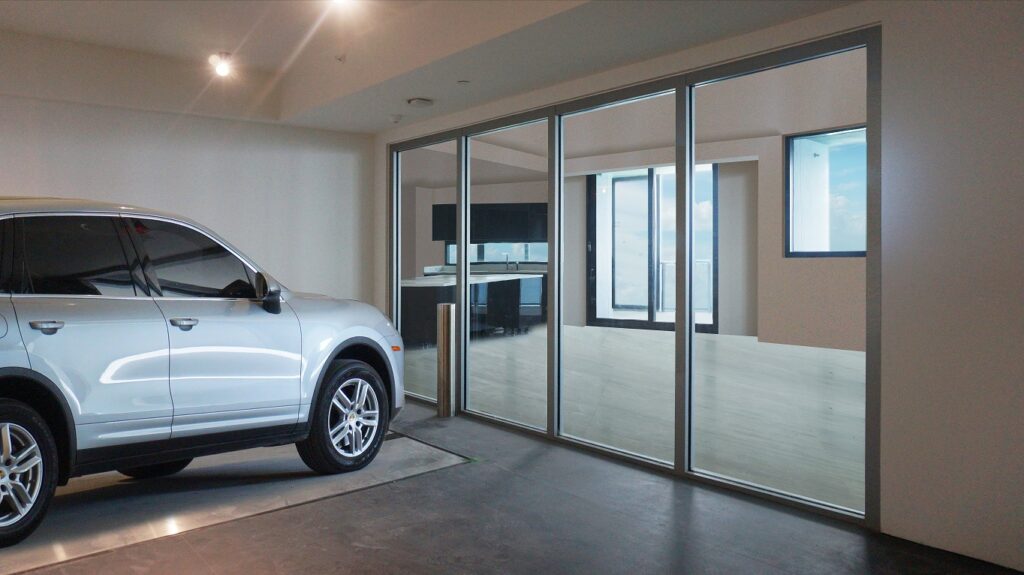 Porsche Design Tower features a unique, first-of-its kind amenity that allows residents of this 60-story luxury residential project to park their cars in glass-walled sky garages adjacent to their units. The residents will ride their car into one of three Dezervators, a patented, fully-automated glass elevator designed by Gil Dezer and his team of engineers. They will remain in their car securely and enjoy oceanfront views as they ascend to their unit. At that point, their vehicle is shuttled to a glass enclosed carport adjacent to their residence. This allows them to leisurely unload their groceries or shopping items.