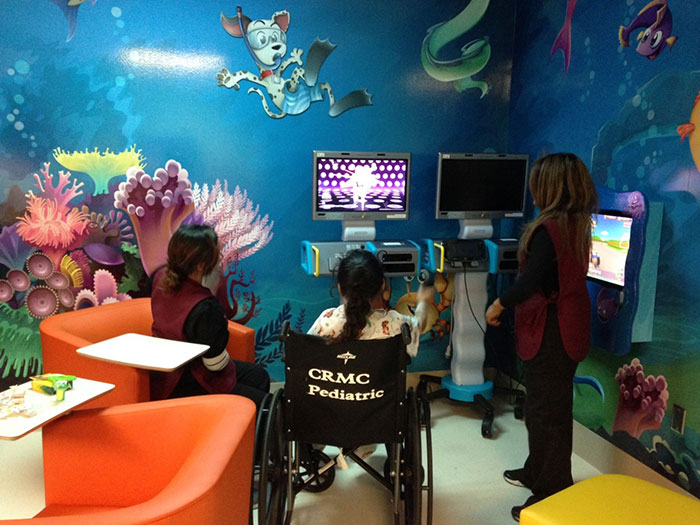 10-year old Eliyana, a patient at the Burn Center, playing with one of the Starlight® Fun Center® mobile entertainment units donated by SAFTI FIRST to provide entertainment to children receiving treatment at the Community Medical Center in Fresno, CA |