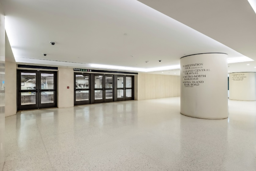 To improve wayfinding and to these new entrances, the architects specified full-vision, 90 minute temperature rise doors to give visitors visual access to the 4, 5, 6 and 7 subways lines. To accommodate the high visitor and commuter traffic, multiple pairs of doors are placed at these new entrances. These doors are equipped with electromagnetic hold opens during normal hours and then closed and secured through a card reader during off hours. The designers also wanted a clean look, so these doors were supplied with concealed rods and multi-point locks that were concealed in the doors.