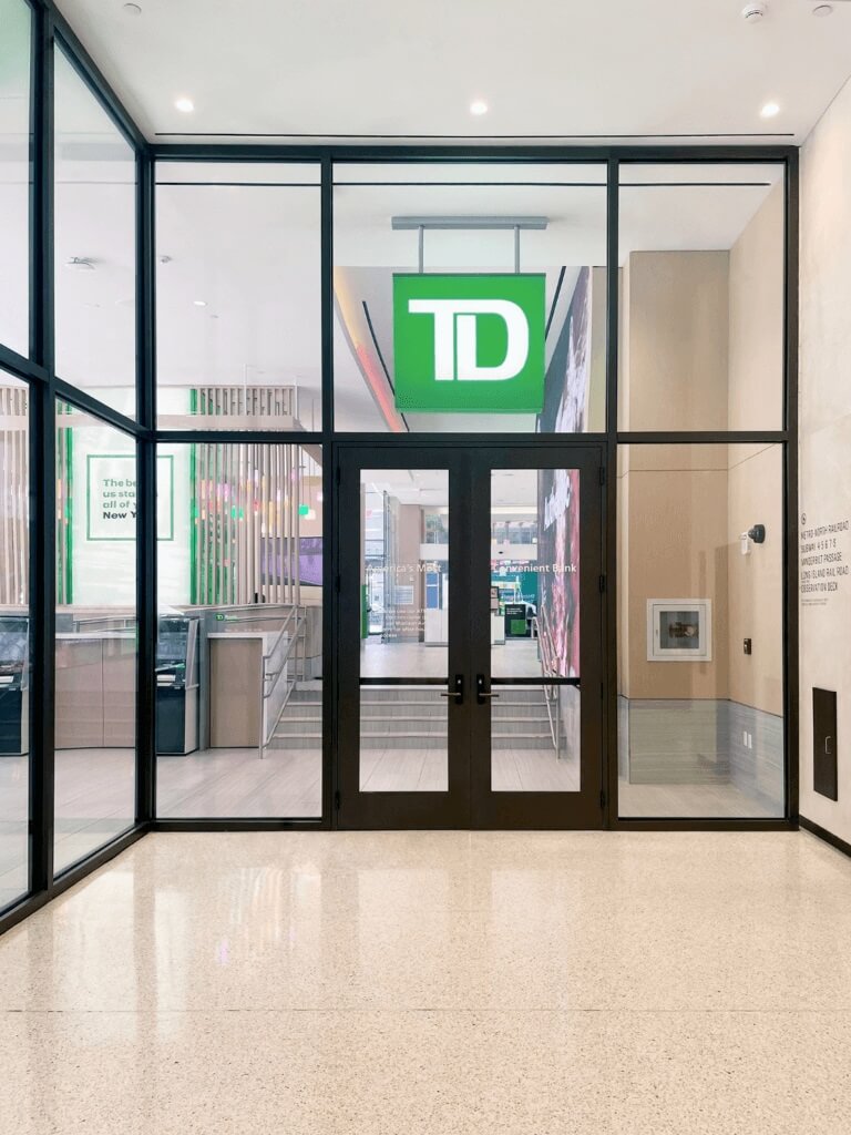 To showcase what TD Bank has to offer, clear, low-iron fire rated glass was used for the storefront and entrance. Spanning floor-to-ceiling at a height of almost 16 feet, the designers wanted as much transparency as possible. To achieve this, SAFTI FIRST® supplied SuperLite II-XLB 120 low-iron in GPX Architectural Series Framing for the ASTM E-119 rated, 2 hour fire resistive assembly. With the largest individual glass list just under 6,000 sq. ft., this was easily achieved by SuperLite II-XLB 120, which has the largest tested and listed sizes for 2-hour fire resistive glazing at maximum size of 7, 980 sq. in. (with a maximum height or width of 133 in.). SuperLite II-XLB 120 was supplied in a low-iron make-up to ensure maximum transparency and to match the low-iron glazing used throughout the building.