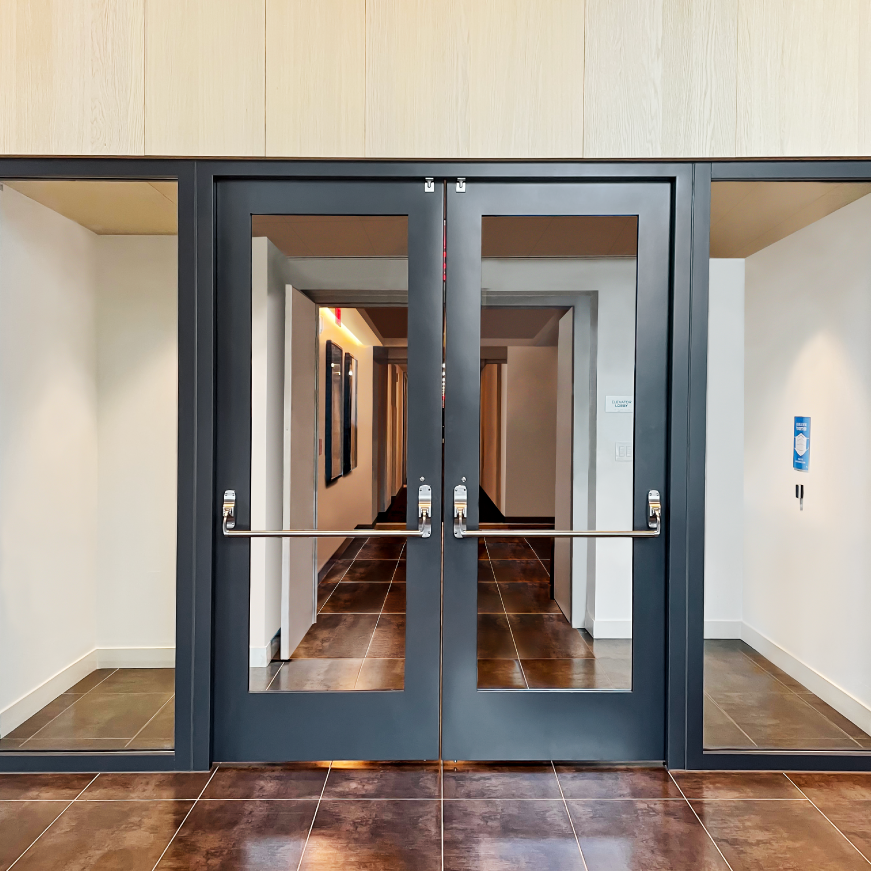 Fire rated aluminum framing with narrow profiles and uniform sightlines. Used with 45 minute glazing for fire protective interior and exterior applications.