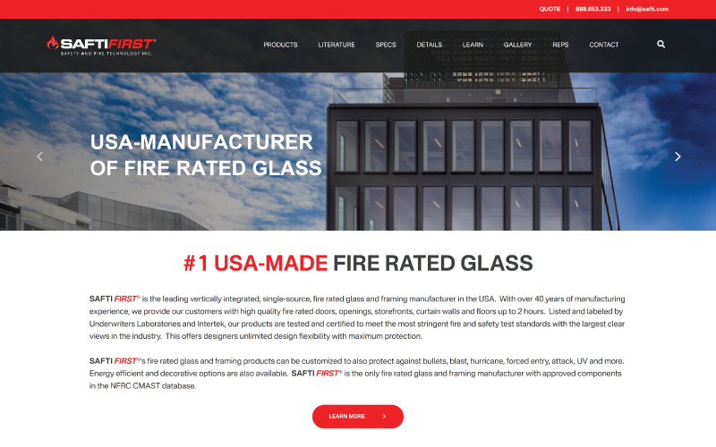 The new website reaffirms SAFTI FIRST’s unique value as the first and only vertically integrated, single-source, fire rated glass and framing manufacturer in the USA. Because of this, SAFTI FIRST is able to provide innovative products with the largest clear views, greatest design flexibility, fastest lead times and most competitive pricing. With over 40 years of experience in advanced fire rated glass and framing systems, SAFTI FIRST offers unmatched expertise, seamless project coordination and best-in-class customer support.