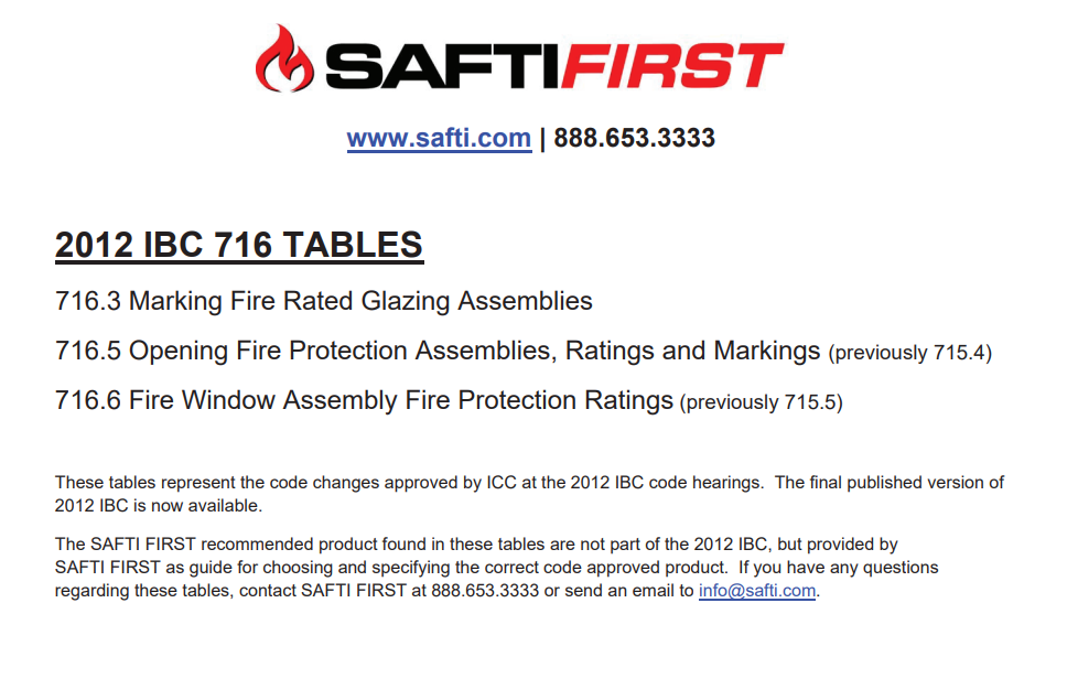 The 2018 version of the Chapter 716 Tables that show the correct and code approved applications for fire rated glass.