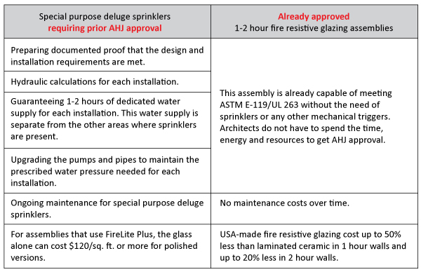 So before going through the AHJ approval process for this alternate assembly using deluge sprinklers, here are a few concerns to help architects and owners make an informed decision. This is in comparison to readily available, USA-made, 1-2 hour fire resistive glazing assemblies that do not need prior AHJ approval.