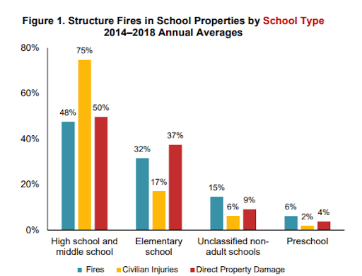 4. In the United States, local fire departments responded to a total of 3,230 fires on school grounds between 2014 to 2018. The fires in these school buildings resulted in an estimated average of one civilian death, 39 civilian injuries, and $37 million in direct property damage per year.