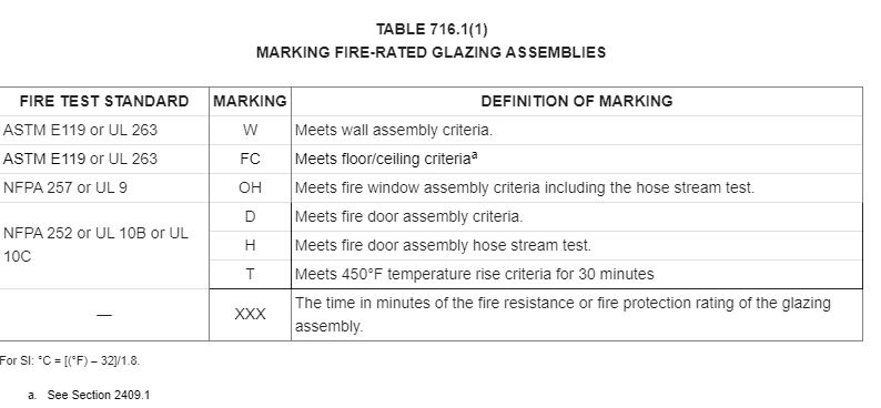 To assist code officials in determining if a glazing product meets 2018 IBC standards, code officials are encouraged to review Table 716.1(1), Marking Fire-Rated Glazing Assemblies: