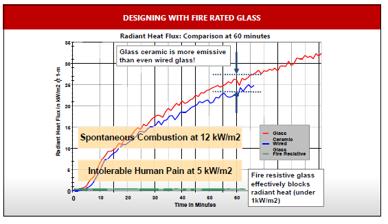 This chart illustrates the extreme differences between fire protective- and fire resistant-rated glazing as it relates to radiant heat transmission. Glazing rated as fire resistant-rated offers building occupants a passive life-safety shield that can be counted on to continuously perform even after the unlikely but possible failure of an active fire suppression system.