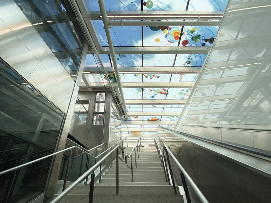 In addition to the 2-hour glass floor, SAFTI FIRST® also provided the fire rated glazing and framing for the 2-hour glass elevator enclosures, using SuperLite® II-XL 120 in GPX® Architectural Series Framing, provide an open and airy feeling, while traveling 70 feet below ground then through the station to reach the station’s platform. Each level is connected by SAFTI FIRST®’s clear decorative fire rated glazing to continue this airy artistic feeling with light flowing down through each floor.