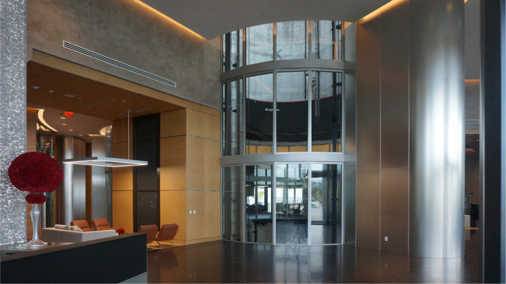 In Section 713 of the IBC, shaft enclosures are required to have a minimum fire-resistance rating of not less than two hours when connecting four stories or more, which was the case for Porsche Design Tower. To meet code requirements and ensure that the ocean views were available, SAFTI FIRST® supplied SuperLite II-XL 120 with GPX Curtain Wall Framing for the 2-hour segmented wall starting from the lobby.