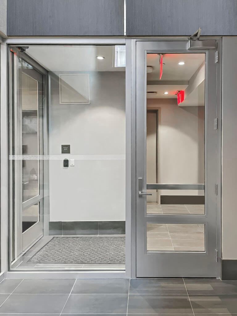 Our fire rated glass doors are available in standard and narrow profiles with multiple finishes including painted, anodized, aluminum clad, stainless steel clad and more. We also offer standard and custom hardware to accommodate various project conditions. They can also be customized to provide additional protection against hurricanes and ballistic attacks.