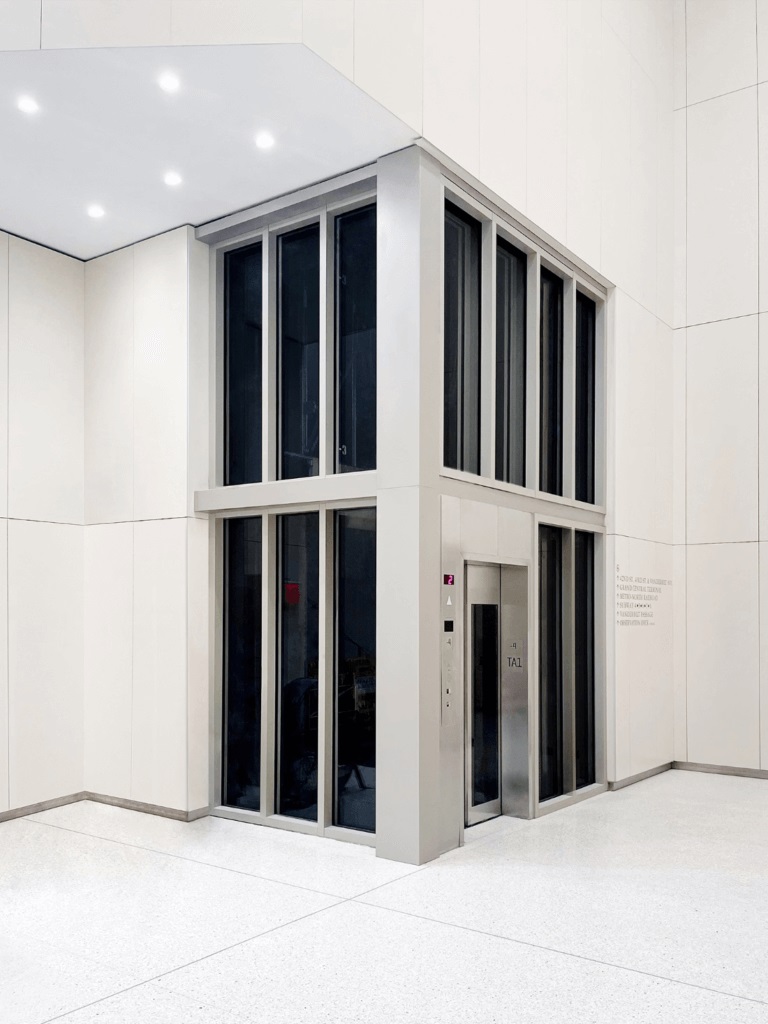 SAFTI FIRST® also supplied SuperLite II-XL 120 low iron in GPX Architectural Series framing for the elevator enclosure for the basement levels. Laminated glass was incorporated into the SuperLite II-XL 120 units to meet the safety glazing requirement for elevator enclosures. Incorporating vision and transparency to these 2-hour elevator enclosures provide an open and airy feeling to visitors as they descend to the basement levels.